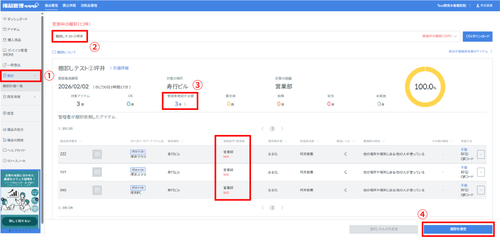 対象となる 棚卸し計画表 を選択します(①・②) - 棚卸し実施者が修正して報告した内容は、「管理者確認が必要」項目に表示され、修正箇所は赤字で表示されます。