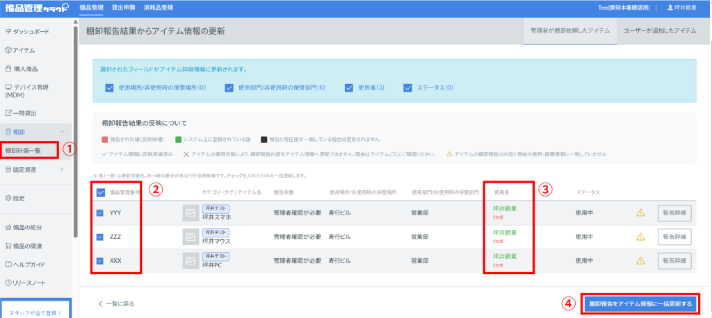 (例:使用者「坪井鈴果 → test」) - 反映したいアイテムを、左側のチェックボックス にチェックします(②)