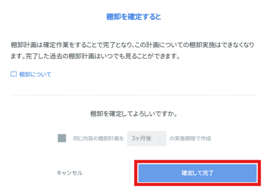 画面右下の 「棚卸し確定」 ボタンをクリックし(④)表示されるポップアップの「確定して完了」ボタンを押下し一度棚卸しを確定します。