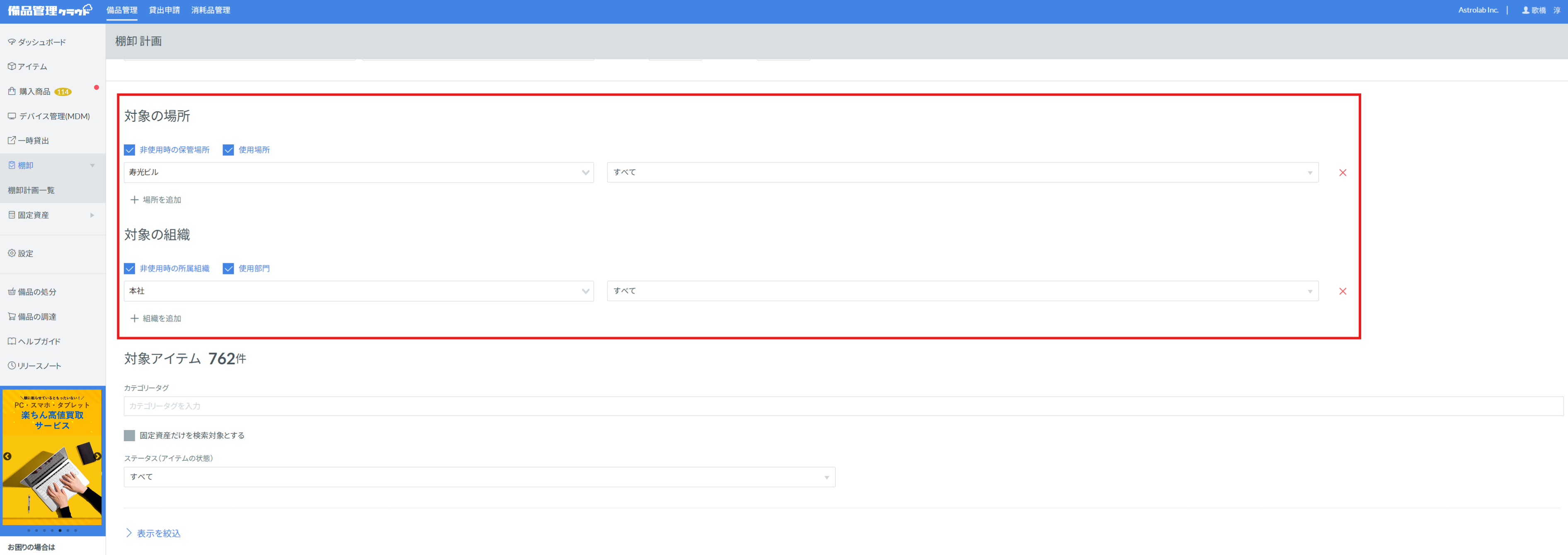 棚卸を実施するために、まずは備品管理クラウドで棚卸計画を作成します。