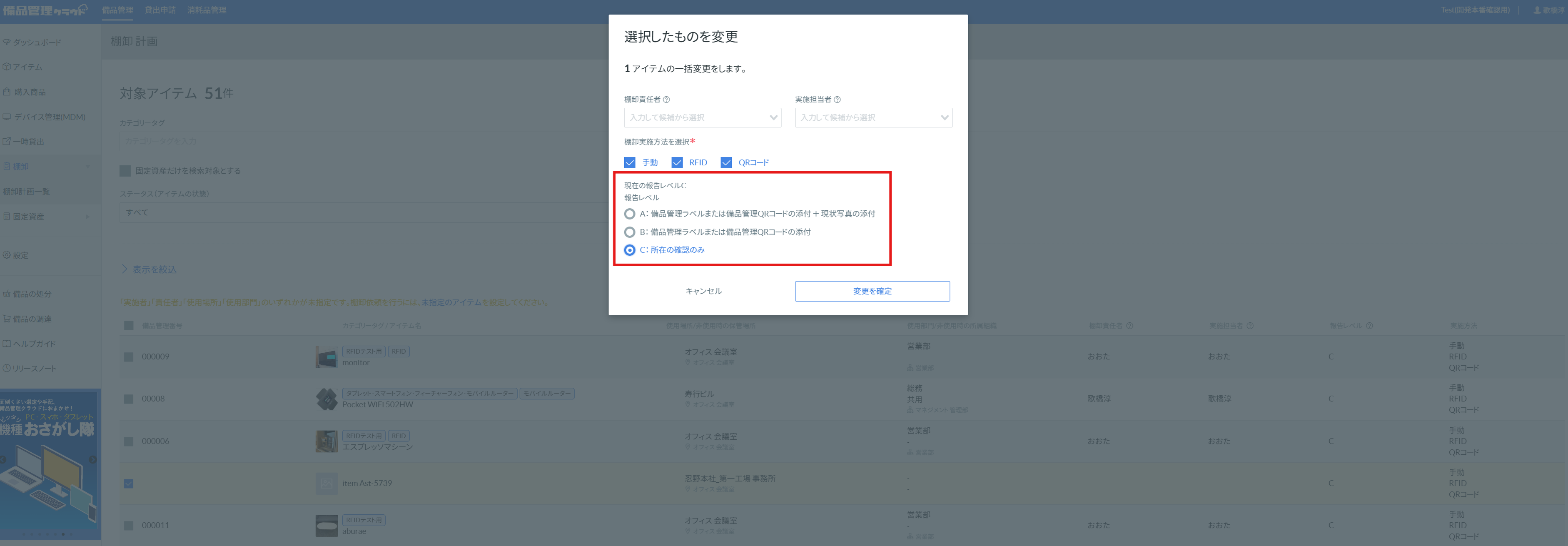 AやBが指定された場合は、棚卸報告をする際に、対象アイテムや備品管理ラベルの写真撮影が必要になります。