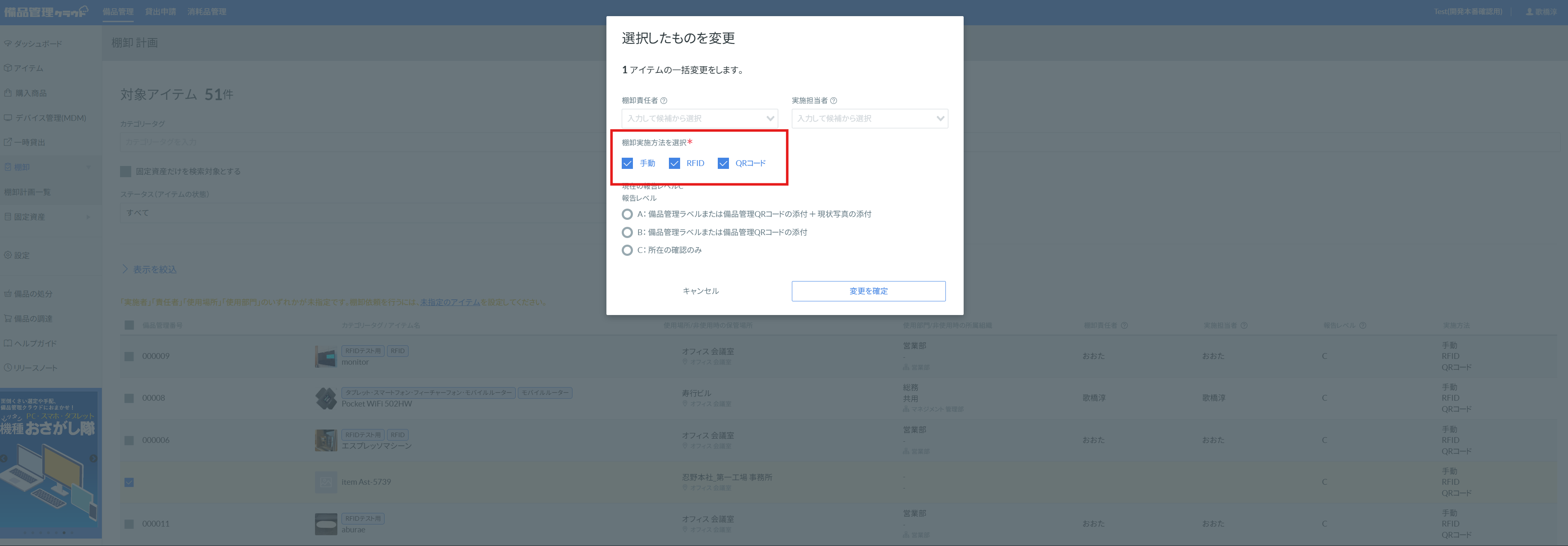アイテムごとに「QRコードで棚卸のみ」「RFIDで棚卸のみ」というように棚卸実施方法を指定することができます。