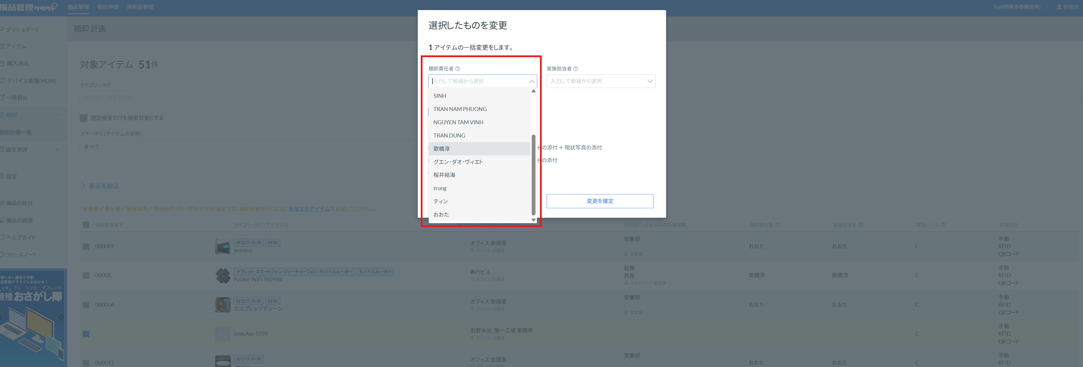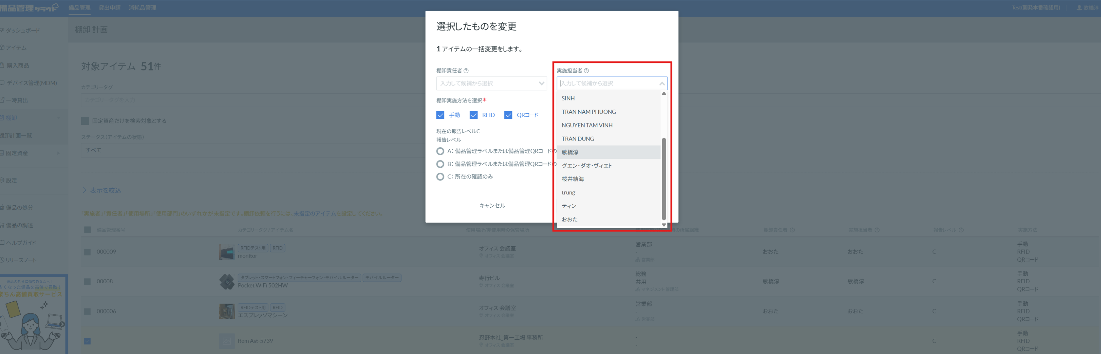 実施担当者はそのアイテムを使用している人が自動で指定されますが、自由に変更することも可能です。