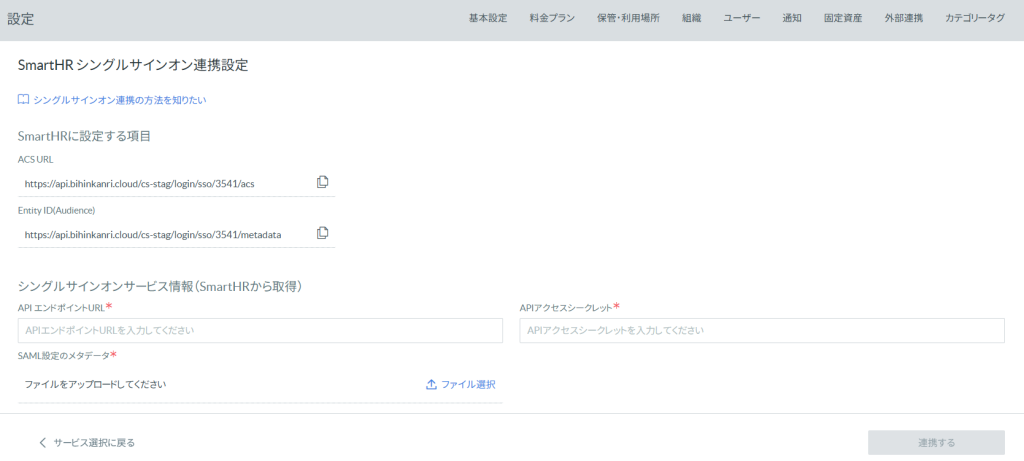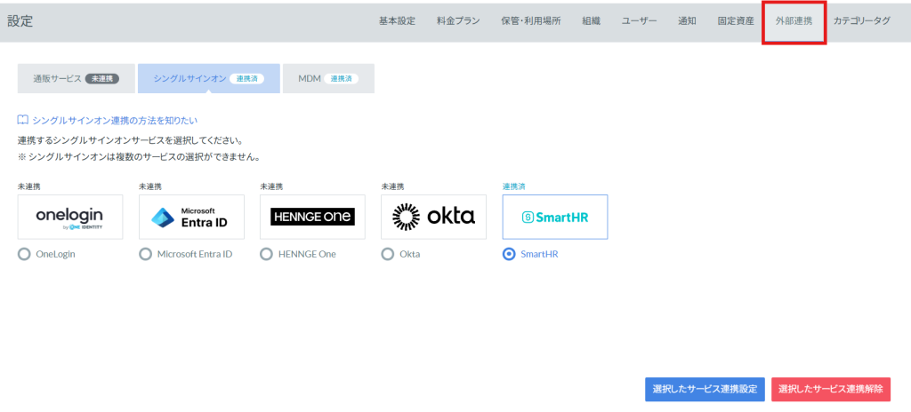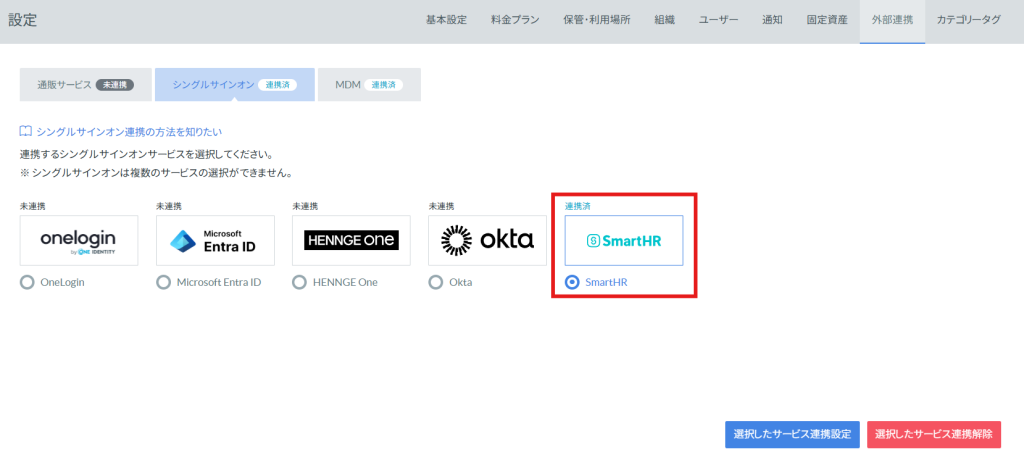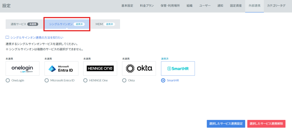 全権管理者ユーザーは、備品管理クラウドからシングルサインオンを設定することができます。