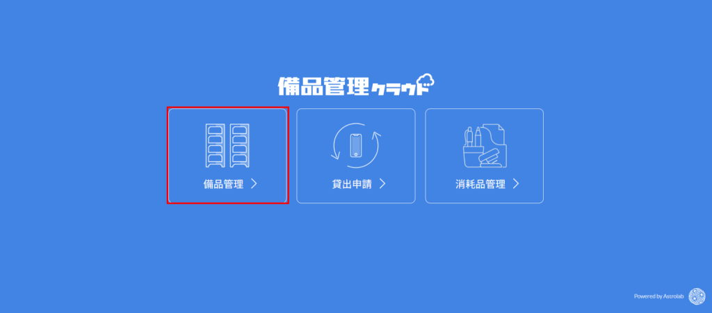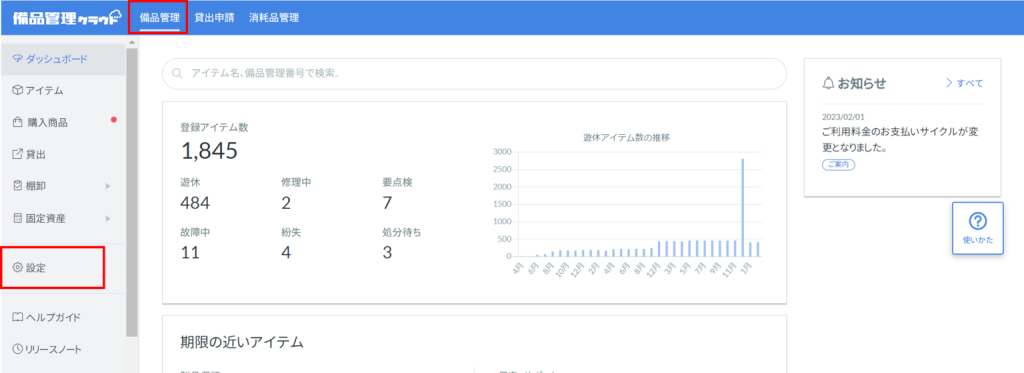 1.備品管理クラウドにログインして「設定」をクリックします。